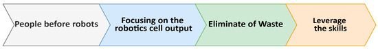 Most manufacturers have adopted industrial robots to simplify and automate their production processes. However, to maintain, sustain, and enhance the capabilities of industrial robots, the future should also involve the integration of lean principles into either the design of robotic systems or the production processes with robots [33,34,35]. Indeed, to achieve this, lean activities continuously include value stream mapping to eliminate waste and achieve the aim of continuous improvement [36,37]. Key indicators of lean robotics systems are presented in Table 4. In this sense, major synergies can be noted between lean principles and robotic workflow as a flexible framework to fit the unique needs of operations.