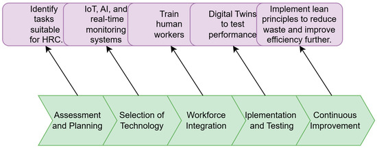 Lean robotics systems with human–robot collaboration (HRC) emphasize the integration of robots into lean production environments, where robots and human workers can work together to optimize processes, increase productivity, and reduce waste. Thus, the lean robotics system with HRC can be represented as follows: