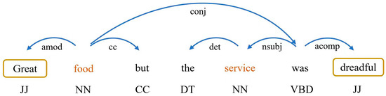Sentiment analysis is usually divided into three levels in the research of NLP: document-level sentiment analysis, which treats the entire document as the basic unit of analysis to identify its whole sentiment polarity; sentence-level sentiment analysis, which focuses on subjectivity detection and sentiment classification for individual sentences; aspect-level sentiment analysis, which adopts a more fine-grained perspective to recognize sentiment expressions related to specific target entities or their attributes. These granularity sentiment analyses usually classify emotions into three categories: positive, negative, and neutral. ABSA is used to classify whether an entire document, sentence (subjective or objective), and aspect expresses a sentiment (positive, negative, or neutral) [1,2]. ABSA helps to better understand the problem of sentiment analysis because it focuses directly on the sentiment rather than the linguistic structure [3] and therefore determines the sentiment polarity of a particular aspect in a sentence. Figure 1 gives a food evaluation sentence, “Great food but the service was dreadful”, where the dependency tags conj: conjunct; amod: adjectival modifier; cc: coordinating conjunction; det: determiner; nsubj: nominal subject; acomp: adjectival complement, the part of speech tags JJ: adjective; NN: noun; CC: coordinating conjunction; DT: determiner; VBD: verb past tense. The purpose of ABSA is to predict the sentiment polarity of food and service aspects, such as “negative” or “positive”. Sentiment categorization as an advanced form of sentiment analysis can provide more nuanced information about opinions.