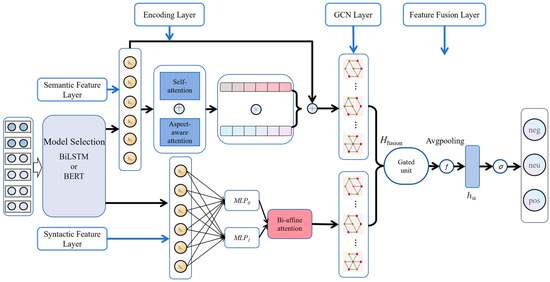 where represents the weight matrix, is the bias term, and denotes a nonlinear activation function, such as the ReLU function. In this way, each node not only contains its own feature information, but also integrates information from neighboring nodes, which enables the model to capture the complex syntactic and semantic relationships between words. The deep propagation of information in the multi-layer GCN structure allows the model to capture dependencies between distant words, which in turn enhances the ability to judge specific aspects of sentiment.