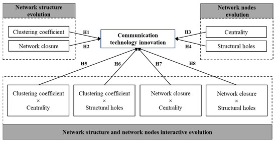 Cooperation networks can be abstracted as topological networks containing only nodes and edges [30]. Innovative organisations represent the network nodes. The cooperation relations between innovative organisations represent the edges, and the intricate cooperation relations constitute the network structure. Therefore, cooperation networks can be divided into network structures and nodes. This paper puts forward research hypotheses from the following aspects: network structure evolution, network node evolution, and the interaction between them. The network structure includes a clustering coefficient and a network closure. Network nodes include centrality and structural holes.