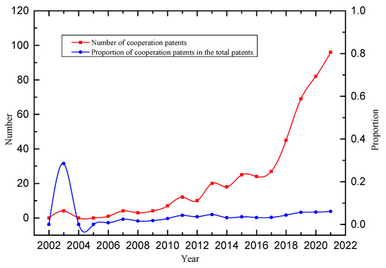 First, we used typical technical names as keywords for patent searches. Keywords include “big data networks”, “ultra-broadband”, “cloud computing”, “high-speed optical”, and “optical fibre”. Second, since patents generally have a three-year review period [22], the period is set from 1 January 2002, to 31 December 2021, to ensure data integrity. Subsequently, 10,096 patents are obtained. Third, only patents with two or more filing institutions are retained. A total of 451 cooperative patents are selected. Finally, each patent’s applicant, date, and region are recorded. The trends of cooperation patents in the communications industry from 2002 to 2021 are shown in Figure 2.