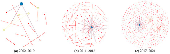 As can be seen from Figure 2, cooperative patents in the communications industry have experienced three stages: the initial stage (2002–2010), the fluctuating stage (2011–2016), and the development stage (2017–2021). In 2002–2010, the number of cooperative patents was small. In 2011–2016, the change in the number of cooperative patents fluctuated but slightly increased. In 2017–2021, cooperative patents grew from 47 in 2017 to 97 in 2021. Although the number is rising, the proportion is always low. The period of subsequent research on network evolution is divided into three stages: 2002–2010, 2011–2016, and 2017–2021.