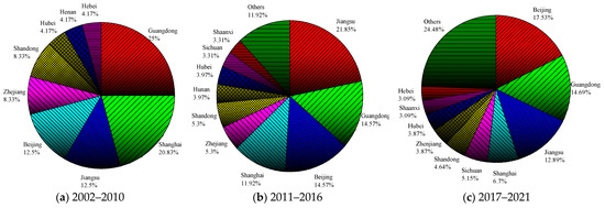The regional distribution of the innovative organisations of networks is shown in Figure 4. In 2002–2010, the top five regions were Guangdong, Shanghai, Jiangsu, Beijing, and Zhejiang. In 2011–2016, Jiangsu rose first, followed by Guangdong, Beijing, Shanghai, and Zhejiang. In 2017–2021, Beijing rose first, followed by Guangdong, Jiangsu, and Shanghai. Regarding regional distribution, Beijing and the southeast coastal region have more innovative organisations. For the agglomeration degree, the top five regions accounted for 79.16%, 68.21%, and 56.96% of the total, respectively. The spatial aggregation of the innovative organisations was high initially and then gradually decreased as the network evolved.