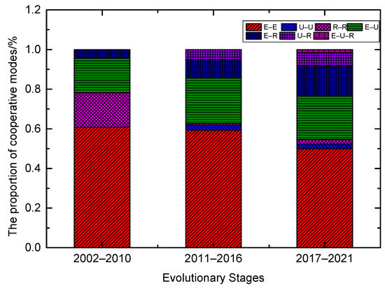 Different partnerships have formed between innovative organisations. Figure 5 shows the characteristics of cross-organisational cooperation. Most innovative organisations have E-E mode relationships between them. The proportion of cross-organisational cooperation (E-U, E-R, U-R, and E-U-R) accounted for 21.74%, 37.29%, and 45.36% in the three stages, respectively. The degree of cross-organisational cooperation gradually improved and reached a medium level.