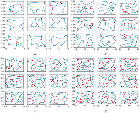 After the model training is completed, the model is tested using a random sampling decoding strategy. Figure 2a–d display the rescue-scheduling plans obtained by solving the model for the 20-point standard dataset, the 40-point scale growth dataset, the 60-point scale growth dataset, and the 100-point scale growth dataset, respectively. The black asterisk represents the initial point, red dots represent rescue points, and the blue line depicts the rescue route of the team.