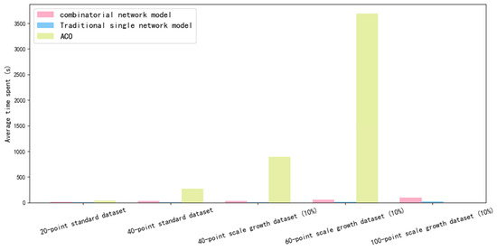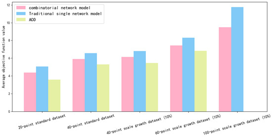 The ACO algorithm, DRL algorithm based on the traditional single network, and DRL algorithm based on combinatorial network model were used to conduct simulation experiments on datasets of different sizes. Each algorithm solved the same dataset 1000 times. The comparison of the average time spent, the average objective function value and the variance is shown in Table 2.