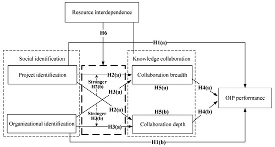 Further, the mediation mechanism between social identification and OIP performance remains unclear. The existing literature mainly adopts a firm-centric perspective to explore how a focal firm can maximize its benefits through open innovation activities [20,21,22]. In the inter-organizational context of OIPs, the overall performance of OIPs depends not only on the focal firm, but also on the knowledge collaboration among different participating organizations. Scholars suggest that inter-organizational knowledge collaboration is an important foundation of open innovation [23]. However, it is an inherently challenging activity when considering its complex characteristics in terms of collaboration breadth and depth. Wider knowledge collaboration breadth (KCB) facilitates diversity in ideas and knowledge sources, while more profound knowledge collaboration depth (KCD) yields creative ideas, nuanced insights, and deep understanding [24,25]. Through the lens of social identity theory, project identification and organizational identification may influence the decisions about KCB and KCD, and performance in different ways as a result. The question of which types of identifications might be the most beneficial for achieving better OIP performance through extending KCB or KCD has not been well addressed.