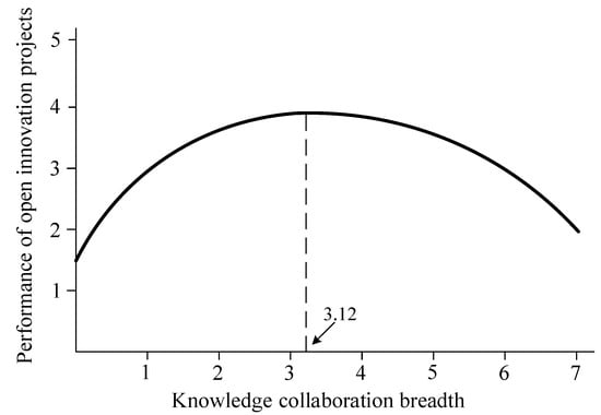 However, more is not always better. Although the intention of absorbing more useful knowledge from broader range of sources is to promote OIP performance, an excessive number of knowledge partners may hinder open innovation. For example, integrating more than three sources of external knowledge into the open innovation process may lead to a decrease in returns [43]. As KCB expands, the collaboration mechanism may struggle to manage the influx of information and coordinate inter-organizational relationships effectively. Similarly, as KCD increases, participating organizations may need to invest more time and effort into inter-organizational interaction. An overly high intensity of knowledge collaboration may generate internal friction in OIPs due to factors such as excessive technological optimization and repeated communication about technical interfaces. These factors would significantly increase transaction costs and damage OIP performance [24]. Moreover, an excessive increase in KCD may induce risks of opportunism, such as “free-rider” behavior and the leakage of core knowledge [59,60]. In addition, the benefits of collaboration breadth and depth are likely to follow the rule of diminishing marginal utility, resulting in a concave benefit curve. However, the costs of increasing collaboration breadth and depth may rise rapidly, leading to a convex or exponential cost curve [24]. According to the explanations of U-shape relationship proposed by [61], these two curves combine additively to form an inverted U-shaped relationship, revealing the “net effect” of KCB and KCD on OIP performance. Thus, we hypothesized the following: