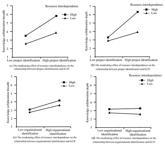 In addition, we evaluated the moderating role of resource interdependence. As shown in Table 4, the results indicate that the interaction terms of project identification and resource interdependence significantly influence KCB and KCD (β = 0.298, p < 0.001 and β = 0.363, p < 0.001, respectively), but the interaction terms of organizational identification and resource interdependence cannot significantly influence KCB and KCD (β = 0.178, p > 0.05 and β = 0.142, p > 0.05, respectively); thus, H6 is only partially supported. The interaction results were plotted at high and low levels of resource interdependence. Figure 3a shows the relationship between project identification and KCB have significantly increased slopes (β = 0.223, p < 0.01 versus β = 0.362, p < 0.001). Figure 3b shows that the slopes of regression lines relating project identification to KCD significantly increase (β = 0.288, p < 0.001 versus β = 0.521, p < 0.001). As depicted in Figure 3c,d, resource interdependence does not significantly moderate the slope of regression lines relating organizational identification to KCB (β = 0.377, p < 0.001 versus β = 0.390, p < 0.001), nor does it significantly moderate the slope of regression lines relating organizational identification to KCD (β = −0.102, p > 0.05 versus β = 0.013, p > 0.05).