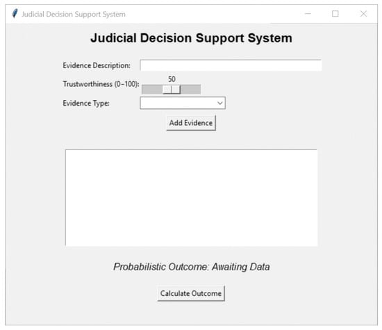 The primary interaction points between judges and the decision support system based on the Bayesian network are represented by the User Input Interface. The interface is crucial for achieving efficient and accurate data entry, ensuring evidence can be processed in real-time during courtroom proceedings. An intuitive and user-friendly interface has been designed, enabling judges to enter and categorize evidence, assign levels of trustworthiness, and receive immediate feedback on the probabilistic impact of each entry. The key elements of this interface are described in the following sections, emphasizing the principles of usability and precision intended to facilitate judicial decision-making.