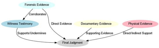 The cognitive limitations of human memory and processing capacity have been extensively documented in cognitive psychology, with Miller’s Law indicating that approximately 7 ± 2 items can be reliably processed by humans at any given time []. The constraint is particularly pronounced in judicial settings, where judges must analyze multiple interrelated pieces of evidence to ensure fair and informed decisions. As legal cases increase in complexity, judges may experience cognitive overload, which can complicate the simultaneous assessment of multiple pieces of evidence. The difficulty is compounded when evidence exhibits intricate dependencies, including corroborating or conflicting witness testimonies, forensic reports, and documentary records.