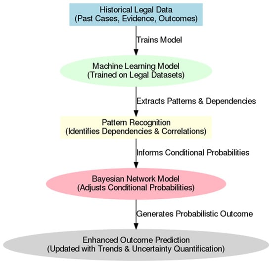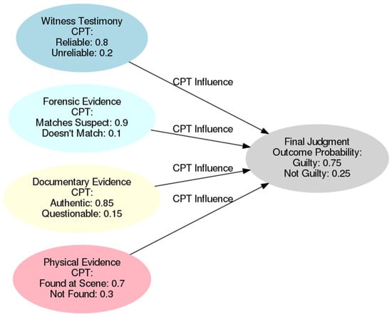 In addition to their transparency, Bayesian networks are recognized for their ability to integrate dynamic evidence, which is considered an essential requirement in iterative judicial processes where information is introduced progressively. The capability of BNs to capture dependencies between diverse evidence types and dynamically adjust reliability assessments was highlighted by Vlek et al. []. The probabilistic nature of Bayesian networks is characterized by the allowance for nuanced evaluations, wherein the weight of evidence may fluctuate based on emerging details. The enhancement of decision accuracy is achieved by implementing this real-time updating feature, which allows for the systematic accounting of the interplay between different pieces of evidence, a process that static decision models do not effectively accommodate.