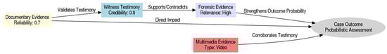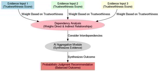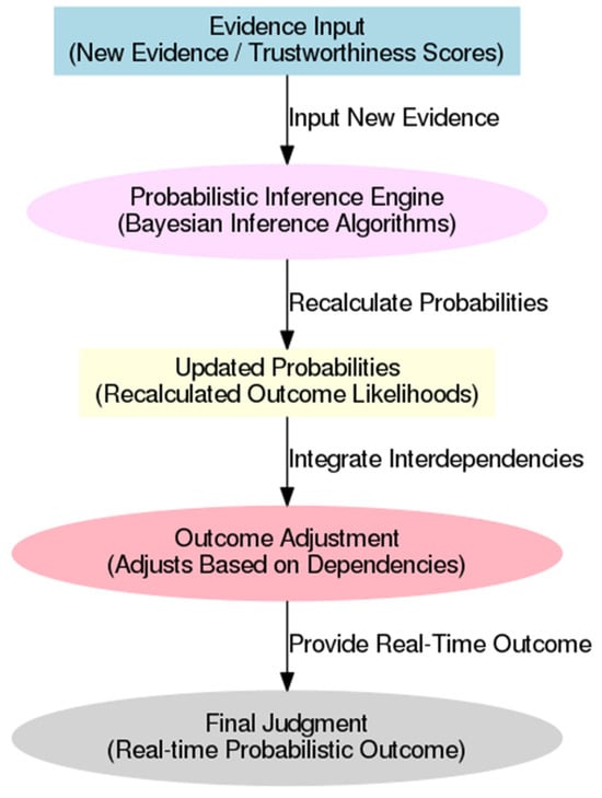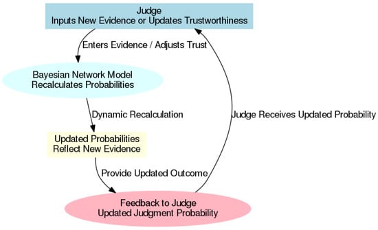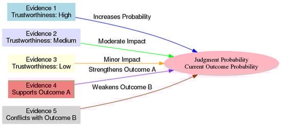 The alignment of trustworthiness levels with existing studies on Bayesian network decision support is emphasized, highlighting the integration of subjective probability assessments to capture expert judgments within the model [,]. It was demonstrated by McLachlan et al. that the improvement of diagnostic accuracy occurred through the allowance for clinicians to rate trustworthiness in real-time, resulting in the refinement of the Bayesian network’s probability calculations to reflect expert insights. In a judicial context, it is noted that this feature enables judges to consider their informed perception of the credibility of each piece of evidence, which directly influences the inferences made by the Bayesian model.