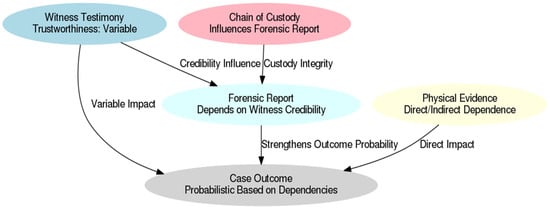 Bayesian networks are applied in specialized legal domains that require complex evidentiary assessments. Bayesian inference within cybersecurity was explored by Sharmin et al. [], and its effectiveness in evaluating the integrity of digital evidence and strengthening security measures in cyber investigations was demonstrated. Their research illustrated the versatility of Bayesian networks in legal applications beyond traditional courtroom settings. Bayesian inference was leveraged to assess the probabilistic relevance of different digital evidence elements, which assisted investigators in distinguishing between credible and potentially compromised information. The broader applicability of Bayesian networks in various legal settings is underscored, particularly in areas where the authenticity and reliability of evidence must be objectively assessed.