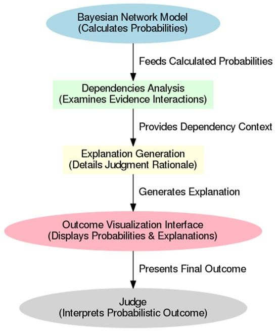 Furthermore, it is acknowledged that user-friendly interfaces are considered a crucial area for development. Many existing AI systems for judicial decision support have been designed for technical users, reducing accessibility for judges and legal professionals lacking a data science or computational modeling background. The simplification of processes related to evidence entry, trust-level adjustments, and probabilistic output interpretation is deemed essential for the assurance of usability. Integrating natural language processing (NLP) into AI interfaces is expected to facilitate judges’ conversational input of evidence, with the system automatically assigning probabilities and dependencies based on contextual information. Furthermore, visualized outputs, such as probabilistic diagrams or interactive evidence maps, are expected to enhance interpretability and facilitate judges’ assessment of case factors more intuitively without requiring extensive familiarity with Bayesian network mathematics [].