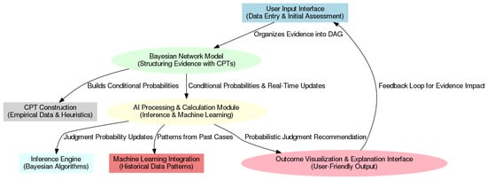 The system has been designed to assist judges in decision-making by synthesizing evidence through a Bayesian network-based AI model. Real-time evidence input is enabled, with probabilistic outputs being dynamically updated to guide judges’ interpretations. The system comprises three primary components: the User Input Interface, the Bayesian network model, and the AI Processing and Calculation Module. The distinct functions of each element in capturing, processing, and analyzing judicial data are served, ultimately resulting in probabilistic assessments being provided to the judge for more informed decision-making.