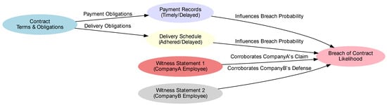 The Bayesian network configuration for dynamic analysis within the case study is illustrated in Figure 14, with evidence items such as the contract, payment records, and witness statements represented as nodes. Dependencies are indicated by directed edges between nodes, such as the influence of payment records on the probability of contract fulfillment and the impact of delivery schedules on the likelihood of a breach. As evidence is updated or added, the probabilities are recalculated by the Bayesian network, resulting in a real-time, data-driven assessment of case outcomes. Judges support the dynamic recalibration of probabilities, reflecting the cumulative impact of evolving evidence, thereby allowing for a nuanced, context-sensitive approach to civil decision-making.