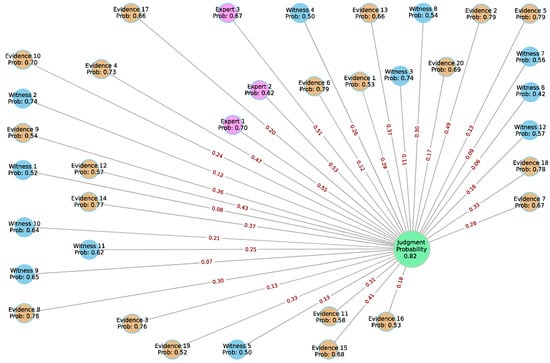 The output and visualization capabilities of the AI system for assessing the likelihood of a breach of contract in the simulated civil case are illustrated in Figure 15. Each node is represented as an element of the case—either evidence, a witness statement, or an expert report—with assigned probabilities indicating its reliability or influence. The connections to the final judgment probability are demonstrated by edges, with varying weights signifying the influence strength of each item. The system aggregates the inputs dynamically, with updated probabilities displayed based on cumulative evidence to assist judges in assessing the likelihood of specific outcomes and visualizing the impact of evidence in real time. The comprehensive visualization is designed to aid judges by providing clarity on the contribution of each evidence type to the overall judgment probability, thereby supporting data-driven and transparent decision-making.
