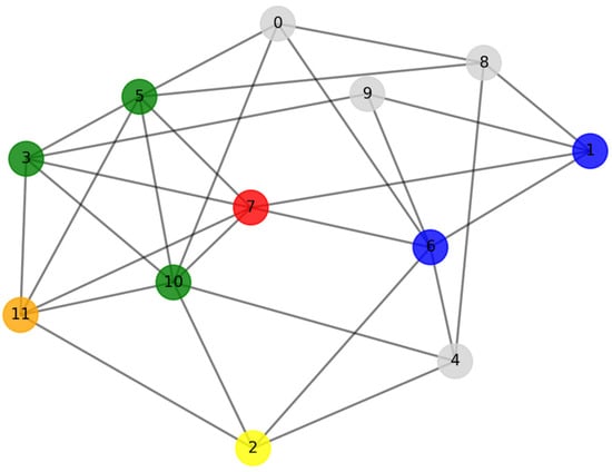 Taking the overlap ratio of nodes 7 (marked in red) and 11 (marked in orange) as an example, as shown in Figure 1, node 7’s neighbors (marked in blue) are 1, 3, 5, 6, 10, and 11. Node 11’s neighbors (marked in yellow) are 2, 3, 5, 7, and 10. The overlapping nodes (the intersection of blue and yellow) are 3, 5, and 10. are the eight nodes marked in color, while are the three nodes marked in green. Therefore, the overlap ratio between nodes 7 and 11 = 3/8 = 0.375.