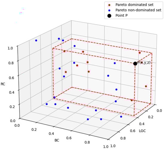 As a consequence, this paper introduced a ranking method based on the Pareto dominated set. Using this, the dominated set of each node is worked out and the sum of the final TOPSIS score is a new indicator to assess journals. Taking point as an example, where x is the standardized LGC(P), standardized BC(P), and standardized RC(P), the dominated set of P is defined by the points in the cuboid that are marked in red, with smaller values of the scores in all three dimensions. Point P itself belongs to the dominant set of P, otherwise, if the dominated set of point P is empty, then the score of point P is 0. If many points are scored as 0, the results will not be comparable. The Pareto dominated set diagram is shown in Figure 3. The new indicator of the Pareto dominated set-based sum of the TOPSIS (PDS-based STS) score is defined as follows [32].