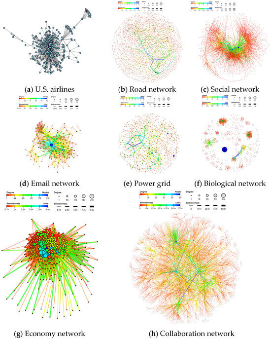 In this paper, eight real networks from six fields were applied to test the performance of PDS-based STS including two transportation networks (U.S. airlines and road network), two social networks (social network and email network), one infrastructure network (power grid network), biological network, collaboration network, and economy network. The descriptions of the data are shown in Table 1, and the visualization of the data is shown in Figure 4.