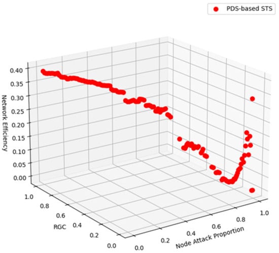 Given the value of α, the PDS-based STS method can be employed to rank node importance and sequentially attack the nodes in the network from highest to lowest importance. The three-dimensional graphs depict the changes in RGC and network efficiency as the proportion of attacked nodes increases (shown in Figure 5). When a certain proportion of nodes is attacked, a faster decline in RGC and network efficiency indicates that the attacked nodes are more critical, demonstrating the effectiveness of the method for identifying key nodes. This approach will also be used later to compare the effectiveness of our proposed method with traditional methods.