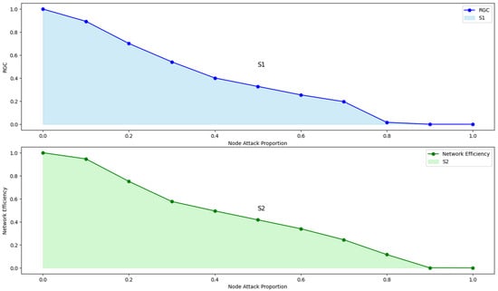 To determine the appropriate value of α for a given network, an optimization method was introduced that uses the area under the curve (AUC) as the objective function. The AUC represents the integral of the relative giant component (RGC) or network efficiency over the range of attack proportions (from 0% to 100%). By minimizing the AUC, the value of α is aimed to be identified, which results in the most rapid and significant decline in network performance when critical nodes are removed. The area enclosed by the curve of RGC versus the node attack proportion and the coordinate axes is denoted as S1, while the area enclosed by the curve of network efficiency versus node attack proportion and the coordinate axes is denoted as S2, as shown in Figure 6. For each specific network, the variation of S1 + S2 was plotted with respect to α, thereby identifying the value of α that minimized S1 + S2 for different networks.