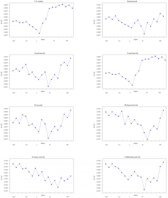For eight real networks, the images in which the sum of areas varied with α was respectively calculated, as shown in Figure 7. This graph illustrates how the combined area under the curves of RGC and network efficiency varied with different values of α. By analyzing this plot, the optimal α value can be identified that minimizes S1 + S2, thereby enhancing the effectiveness of our critical node identification model for the given network. The optimal α for the email network was 1.27, while for the U.S. airline network, it was 2.34. Using the same method, the optimal α values for eight real-world networks were calculated, as shown in the Table 2. For large-scale networks, approximate methods were employed for calculating the LGC and BC provided by the Networkx library, which significantly reduced the computation time.