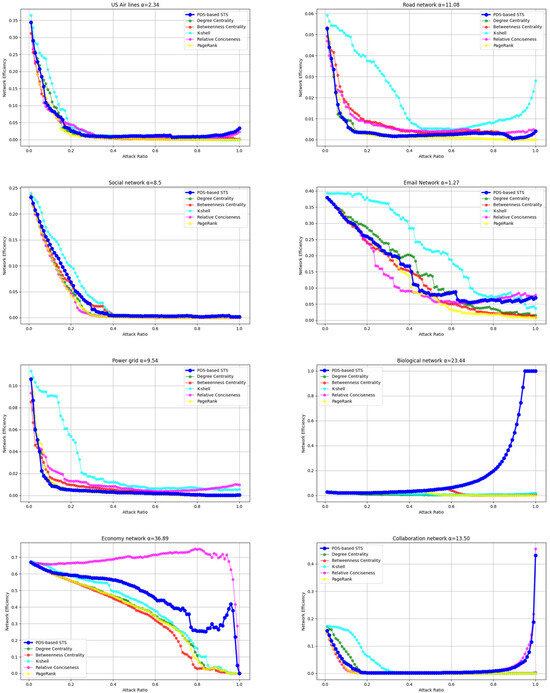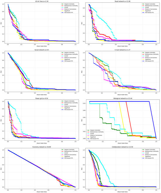 The analysis across multiple networks showed that the PDS-based STS method consistently demonstrated strong performance in identifying key nodes, as indicated by the rapid decline in network efficiency with increasing attack ratios. This suggests that the method was effective in accurately pinpointing critical nodes, which, when removed, resulted in a significant reduction in network efficiency. However, in a biological network and collaboration network with low connectivity, these were often disconnected. When many network nodes were disconnected, the network efficiency was very low, and the number of network nodes decreased, but the remaining network efficiency increased. The PDS-based STS method performed relatively poorly in these kinds of networks compared with its performance in other networks. Despite this, the overall trend still highlights the robustness of the PDS-based STS method across most network types, outperforming other centrality measures in most cases.