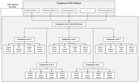 In the proposed model, the mission is decomposed and mapped to the basic equipment units in a layer-by-layer approach, taking the equipment SOS that completes the mission as the object of study and assuming multi-phase mission advancement as its logical progression. As the mission time advances, the equipment SOS will be adjusted according to the mission requirements. Therefore, the support task generation process takes the operation mission scenario as the beginning point for input and dynamically couples mission-related elements, such as MX support organization, equipment unit MX control, support action implementation, support resource utilization, and support command, to facilitate the study of the emergence and evolution rules.