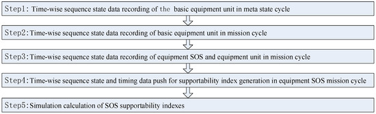 The resulting model for equipment SOS evaluation includes the recording of equipment SOS states and the calculation of SOS supportability indices, each comprising five distinct steps, as shown in Figure 3: (1) recording of time-wise sequence state data for a basic equipment unit within a meta-state cycle; (2) recording of time-wise sequence state data for a basic equipment unit within a mission cycle; (3) recording of time-wise sequence state data for the equipment SOS and equipment unit within the mission cycle; (4) in the device SOS task cycle, use of time-sequenced states and timing data to generate the maintainability index; and (5) computational simulation of the SOS supportability indices. The steps are described in detail as follows.
