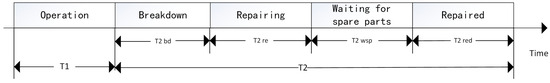 In Figure 4, denotes the normal working time of the equipment unit; denotes the time when the equipment cannot operate normally, defined as ; denotes the equipment failure time; denotes the equipment MX time; denotes the equipment waiting time for spare parts; and denotes the MX time after the arrival of spare parts.