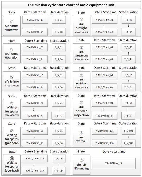 During the simulation propagation process, various basic equipment unit states occur according to their corresponding probabilities. For the application considered in this study, the basic equipment unit may be in one of the twelve states listed in Figure 6, where the normal shutdown and normal operation of an aircraft represent readiness states and the remaining states represent unreadiness states.