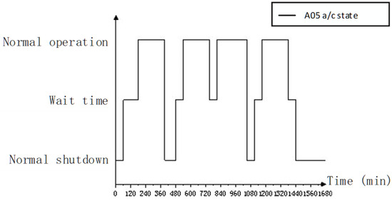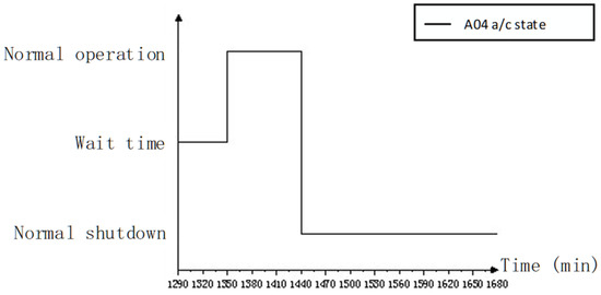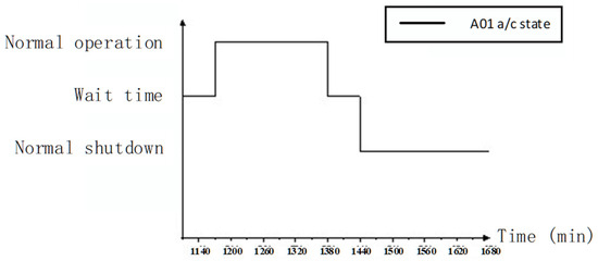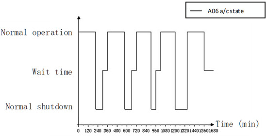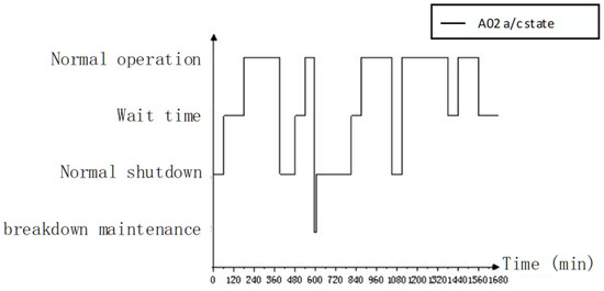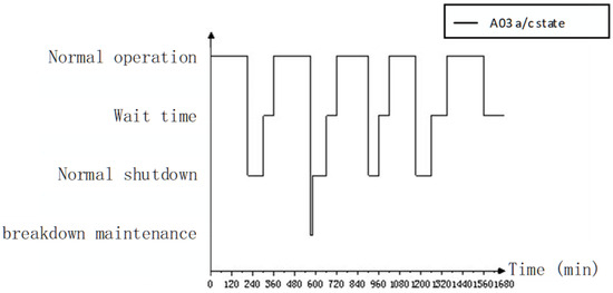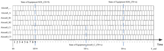 Step 3 records the time-wise sequence state data of the equipment SOS and equipment units within a mission cycle using the model shown in Figure 7. An equipment SOS comprises several basic equipment units in actual tasks, such as ten aircraft equipment units of the same type. The equipment system considered in this study consists of ten aircraft equipment units from two distinct types. The time-wise sequence states of the equipment SOS are determined by the combination of the time-wise sequence states of its basic equipment units, with the recording rate established based on the minimum time step of the simulation. In accordance with the requirements of simulation granularity, the recording mode can be adjusted along the event time. The SOS state at time () is represented as and the equipment unit state at time () is represented as .