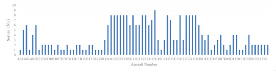 The results indicate that, for example, aircraft A02 has a total readiness time of 1547 min and a mission time of 770 min, and performs five sorties during the mission. It fails at 9:50 on 1 February 2025 and returns to a state of readiness at 10:03 on the same day. Consequently, the development of a support plan and the allocation of support resources can be augmented based on these statistical results. The fuel consumption of aircraft A02 can be calculated according to the mission duration using these results. Based on the simulation data of the states of each individual aircraft, further calculations can be made to produce statistical information including the number of sorties, combat action OA, and mission times for the aircraft. Figure 14, Figure 15 and Figure 16 show the per-aircraft breakdown of sorties, OA, and mission time.