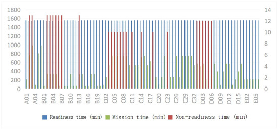 The per-aircraft state data indicate that the range of single aircraft sorties is [1,9]. Among them, C18 participates in the maximum of nine sorties, while D14 participates in the minimum of one sortie. Notably, the proportion of aircraft with two sorties is the largest, accounting for 25% of all aircraft. The overall support resources can thereby be configured by considering the intensity of only two aircraft (C18 and D18), with particular emphasis on aircraft C18 to ensure the adequate provision of support resources. The range of single aircraft readiness time is [1547, 1560] minutes; aircraft with a readiness time of 1547 min accounted for 11.2% of all aircraft, while those with a readiness time of 1560 min accounted for 67.5%. Owing to the short mission time, most aircraft remained in good condition during the mission cycle; the range of single aircraft mission time is [60, 989] minutes, and aircraft with a mission time of 750 min comprised the largest proportion at 16.2% of all aircraft. Given the model and task requirements, the distribution of task durations is scattered, which is in line with the actual mission configuration.