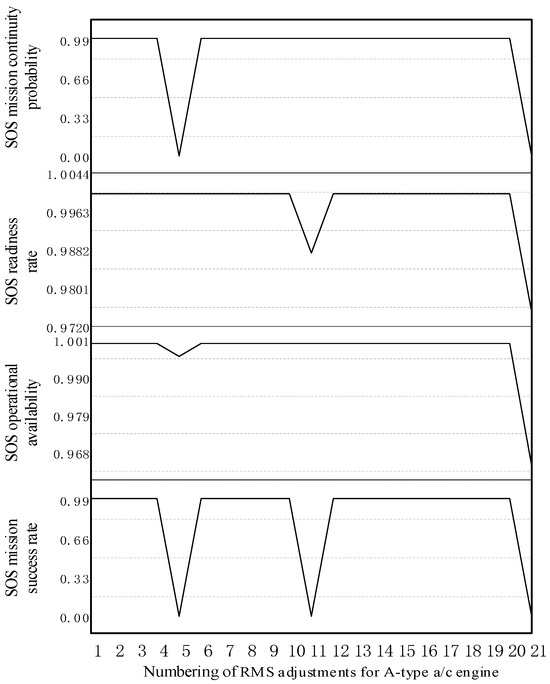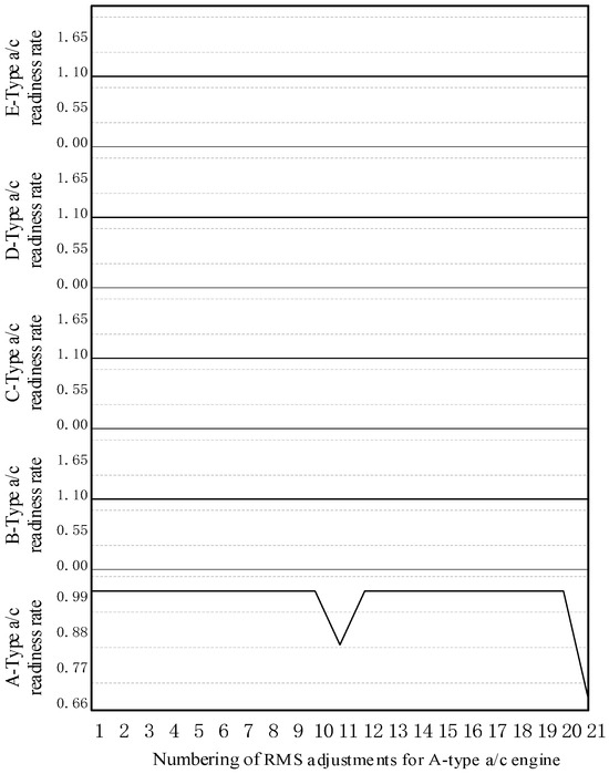 (3) RMS Sensitivity Analysis: Based on the basic data input, both single and compound parameters for LRU components (including critical and general parts) can be adjusted to perform a sensitivity analysis [33]. The fundamental capabilities of support systems for operational missions can be evaluated by analyzing the effect of the resultant changes in SOS supportability indices. Taking the A-type aircraft as an example, adjustments to the RMS values for the “a/c engine” parameter, as presented in Table 2, result in corresponding changes to the supportability indices. The resulting trends in RR, OA, and SOS supportability for the A-type aircraft are illustrated in Figure 17, Figure 18, and Figure 19, respectively.
