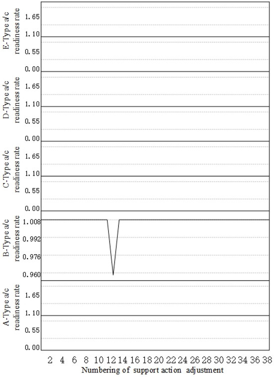 The change trends in the SOS MSR, OA, and MCP exhibited similar patterns, indicating that the SOS mission could be successfully completed. Notably, the SOS RR was maintained at 100%, demonstrating that all basic equipment units were restored to a state of readiness by the end of the mission. Adjustments in the mission intensities for A-1, B-3, C-1, C-2, C-3, and D-3 resulted in a reduction in both SOS MSR and MCP to 0%. Furthermore, the adjustment in C-3’s mission intensity led to a decrease in SOS OA to its lowest value of 84.94%, indicating that the continuous advancement of the mission was not feasible. Consequently, it was imperative to enhance the monitoring of C-type aircraft operations during the third phase and develop a comprehensive plan aimed at improving operational efficiency and MX support.