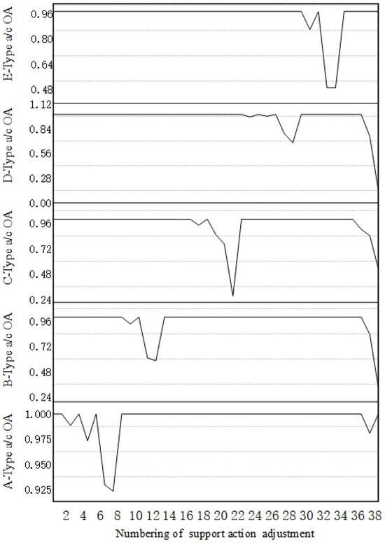 However, the adjustment to support resources had a significant impact on the OA of each aircraft type. Specifically, when the number of A-type power vehicles was decreased by 90%, the aircraft OA decreased to 92.31%. In particular, when the number of accessory oil vehicles (which serve as general vehicles for all five aircraft types) was decreased by 80%, the OA of A-type aircraft decreased to 98.08%. Furthermore, when this number was decreased by 90%, the OA for B- and C-type aircraft reached its minimum values of 33.33% and 14.29%, respectively. Furthermore, when the number of E-type power vehicles was decreased by 80%, the corresponding aircraft OA reached its lowest value of 57.14%. Thus, general-purpose and specialized support resources with the same configuration can have different effects on the occurrence of minimum OA across different aircraft types.