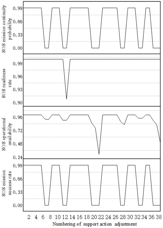 These three points demonstrate that the relevant case verification based on mission-driven simulations of support effectiveness, using the SOS evaluation model proposed in this study, is basically consistent with various conclusions obtained in previous research [30]. Therefore, the proposed mission-driven simulation using the support effectiveness evaluation model can be considered reasonable.