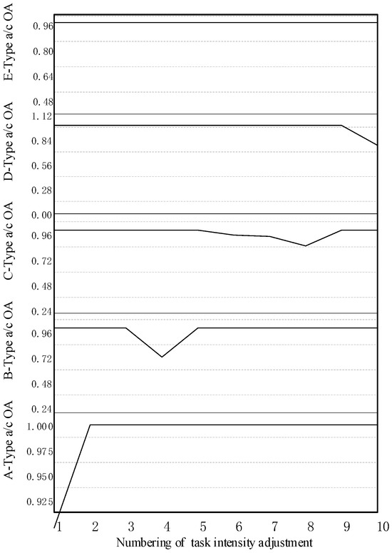 The analysis indicates that the six E-type aircraft required are in a state of operational readiness during the third mission phase; i.e., the OA of E-type aircraft remained unchanged, indicating a high level of configuration redundancy for this aircraft type. The task intensity adjustments in A-1 decreased the OA of A-type aircraft to its minimum value of 89.74%, while those in B-3 decreased the OA of B-type aircraft to 72.22%, those in C-3 decreased the OA of C-type aircraft to 84.94%, and those in D-3 decreased the OA of D-type aircraft to 77.39%.