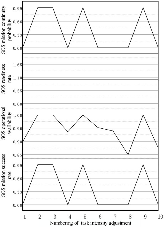 (5) Sensitivity Analysis of Mission Intensity: The sensitivity of each supportability index can also be analyzed by adjusting the task intensity for each aircraft type across each different mission phase, as listed in Table 4. In this table, the letter designates the aircraft type, while the numerical value corresponds to the sequence of mission phases. For example, A-1 refers to the first mission phase of the A-type aircraft. Simulations were conducted based on these adjusted values, yielding the resulting change trends in aircraft OA (task intensity adjustment) shown in Figure 23. Additionally, the change trends in the SOS supportability indexes (task intensity adjustment) were obtained and are shown in Figure 24.