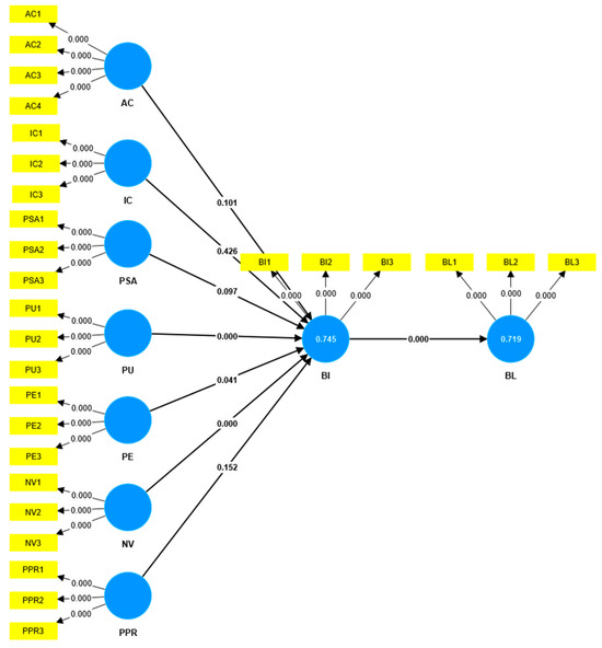 It has been demonstrated that bootstrapping works better than other mediation tests for determining the relevance of the mediating role of brand image [80]. We run bootstrapping tests on 5000 bootstrapping samples using Smart PLS 4. Three significant mediating effects are indicated by the results displayed in Table 10. In other words, brand image acts as a mediator between perceived usefulness, perceived enjoyment, and novelty as drivers of brand loyalty.