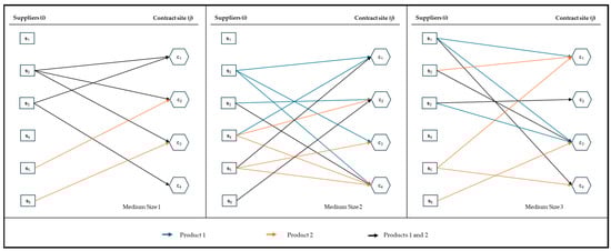 To illustrate, medium-sized instances were considered. Figure 3 shows the selected suppliers and the allocation of the products to the different contract sites.
