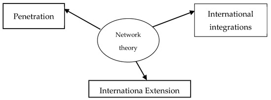 Moreover, network theory takes a diverse view of the internationalization approaches by arguing that a growing firm can instantly start operating internationally supported by partners that have international experience and operations [26]. In the network mechanisms, a firm internationalizes when it initially starts to develop a linkage with business actors belonging to another network in a foreign country. This extra-communication acts as a bridge to foreign markets, and the firm depends on resources controlled by the other actors in the system of dealing [39]. To understand the approaches in network theory, see Figure 1 below.