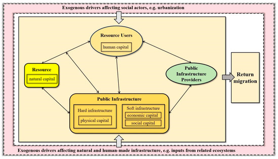 The rural area is a complex social ecosystem, which is connected with the ecosystem and influenced by various social systems [36]. This paper employs the CIS framework, which is suitable for analyzing the interactions among internal components of rural social ecosystem, in conjunction with the sustainable livelihood capitals, to assess how rural social ecosystem impact return migration. The CIS framework (Figure 1), evolved from the combination of the Institutional Analysis and Development (IAD) framework and the Social–Ecological System (SES) framework, constructs the interaction between the four subsystems of resource, resource users, public infrastructure providers, and public infrastructure. The resource refers to the natural conditions of a village, such as climate, water resource, and topography. Resource users are reflected in the demographic characteristics of the village, such as population size, population density and population quality. Public infrastructure providers are manifested in the governance attributes of the village, including the number and caliber of village officials, the presence of support units, and the extent of support from higher governance levels. Public infrastructure is an important part of the CIS framework. As Anderies et al. [37] detail, the infrastructure composing the CIS framework is primarily divided into two types. The first type is hard infrastructure, which pertains to artificial service facilities such as roads, farmland water conservancy, water supply, and power supply. The second type is soft infrastructure, which encompasses intangible tools that can be utilized alongside other types of infrastructure, such as village regulations and local policies. In comparison to the IAD framework, which focuses on single-action situations, and the SES framework that emphasizes variables within hierarchical structures, the CIS framework highlights the fundamental interactions within social–ecological systems. It adds eight interconnections between the internal components of the system, establishing links between different elements to form multiple action situations, with a particular focus on the dynamic combinatorial relationships between elements [38].