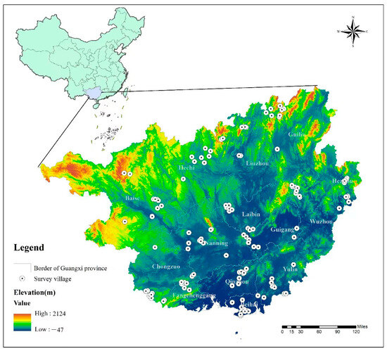 This paper uses data from the “100 villages and 1000 households” questionnaire survey, conducted by 79 carefully recruited and trained investigators across 14 cities in Guangxi from September 2023 to February 2024. The questionnaire comprises two sections, namely a village-level questionnaire and a household-level questionnaire. The survey primarily assessed the basic conditions of villages and farmers, land use, infrastructure, digital technology application, rural tourism, natural disasters, social capital, rural governance, education, and environmental management over the past three years. To enhance the survey samples’ comprehensiveness and representativeness, this study adheres to a stratified sampling method, starting with city–county–township (town)–village–household selection, detailed as follows. The process commences with the selection of 14 cities in Guangxi, followed by the random selection of 1–2 counties from each city, 6–8 towns and townships from each county, 2–3 villages from each township, and 7–11 farmers from each village. Ultimately, a delegate from each village’s “two committees” familiar with local affairs participates in the village-level survey, while a household member represents each home in the household-level survey. Finally, a total of 131 village-level samples and 988 household-level samples from 14 cities across the Guangxi region were selected as the subjects of this study. Figure 3 shows the distribution of villages studied in this paper.