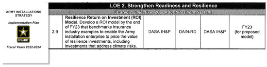 Related to the first decision, the army released the Army Installation Strategy (AIS) [6] and a corresponding Army Installation Strategy Implementation Plan (AIS-IP) [7] in 2020, which recognized the potential impacts of severe weather caused by climate change. The AIS-IP emphasizes the importance of increased infrastructure resilience to climate change and lists several tasks under four lines of effort (LOEs) to implement installation strategy across the army. LOE 2 focused on strengthening readiness and resilience and had 10 tasks.2 Task 2.9 required a resilience ROI model. Figure 1 shows the task description, and the army organizations involved. This research supported the office of the Deputy Assistant Secretary of the Army for Installations, Housing and Partnerships (DASA-IH&P) and the Department Chief of Staff (DCS) G-9 (DAIN-RD) assigned with the task of governing the development of a ROI model to evaluate installation resilience investments, including those that address climate risks.