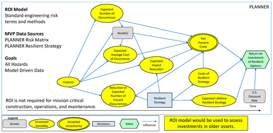The MVP ROI model and its corresponding influence diagram in Figure 3 uses standard risk analysis and engineering economic analysis terms and methods. The model uses data from the PLANNER Risk Matrix and PLANNER Resilient Strategies modules and is an all-hazards model, albeit most of the current PLANNER data are for environmental hazards. We expect installation planners to assess potential resilient strategy investments for non-mission critical assets that have not been constructed to be resilient to the specified hazard(s). The ROI calculation may not be required for mission critical construction, operations, and maintenance that have been constructed to be resilient to the specified hazard.